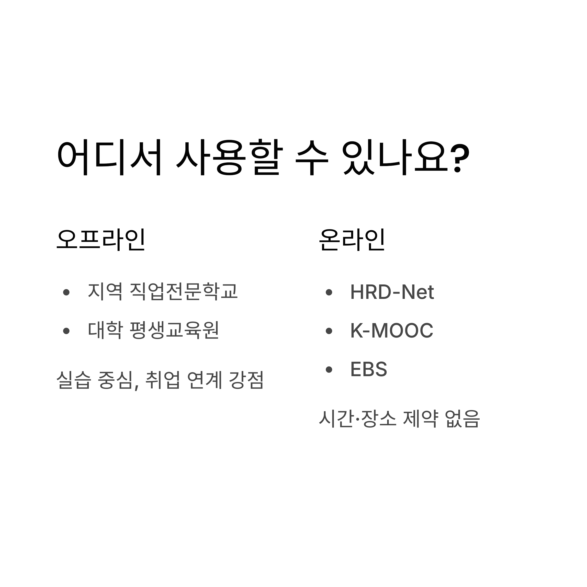 | 온라인 | HRD-Net, K-MOOC, EBS 등 | 시간과 장소 제약 없음, 자율 수강 가능 |