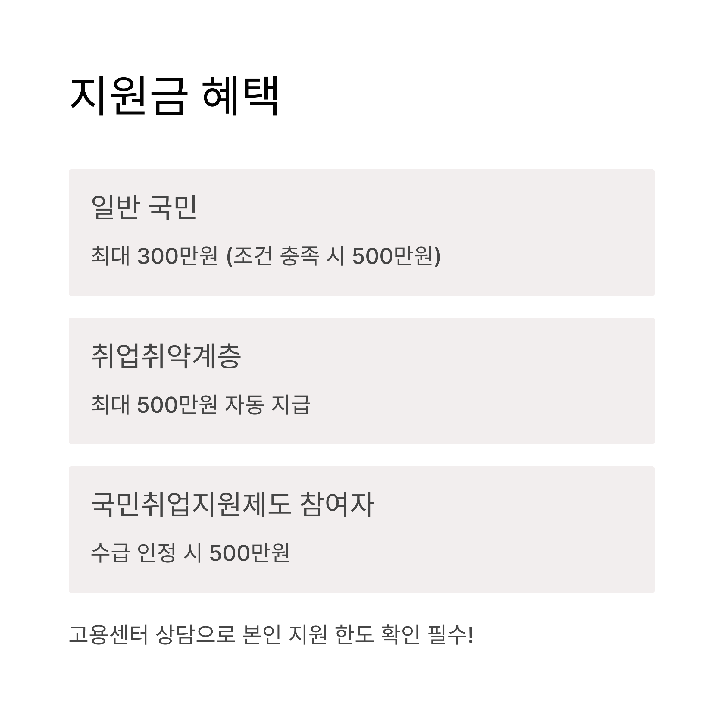 | 취업취약계층 | 500만원 | 자동 최대 지급 |