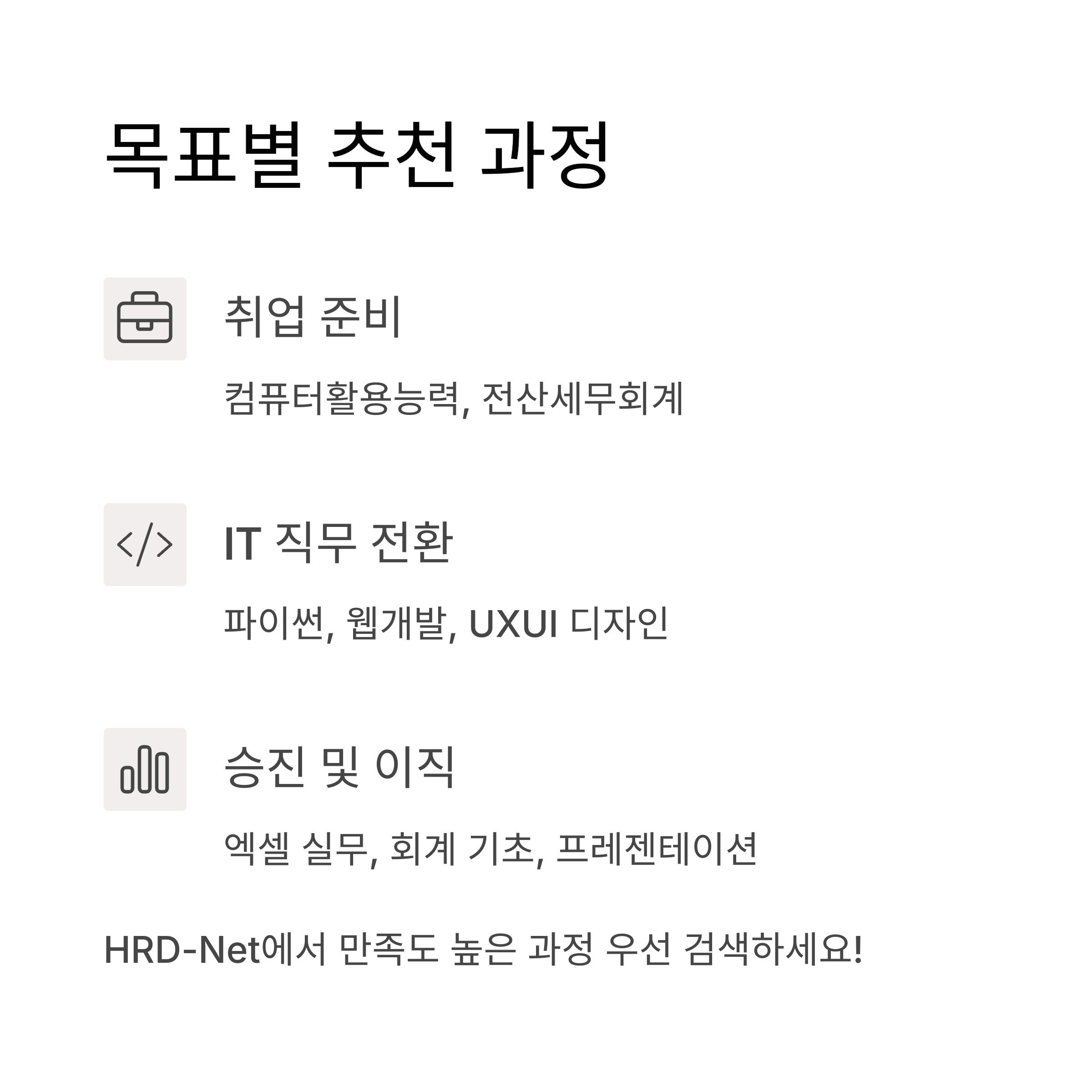 핵심: HRD-Net에서 수강 후 만족도 높은 과정을 우선적으로 검색하는 것이 좋습니다.