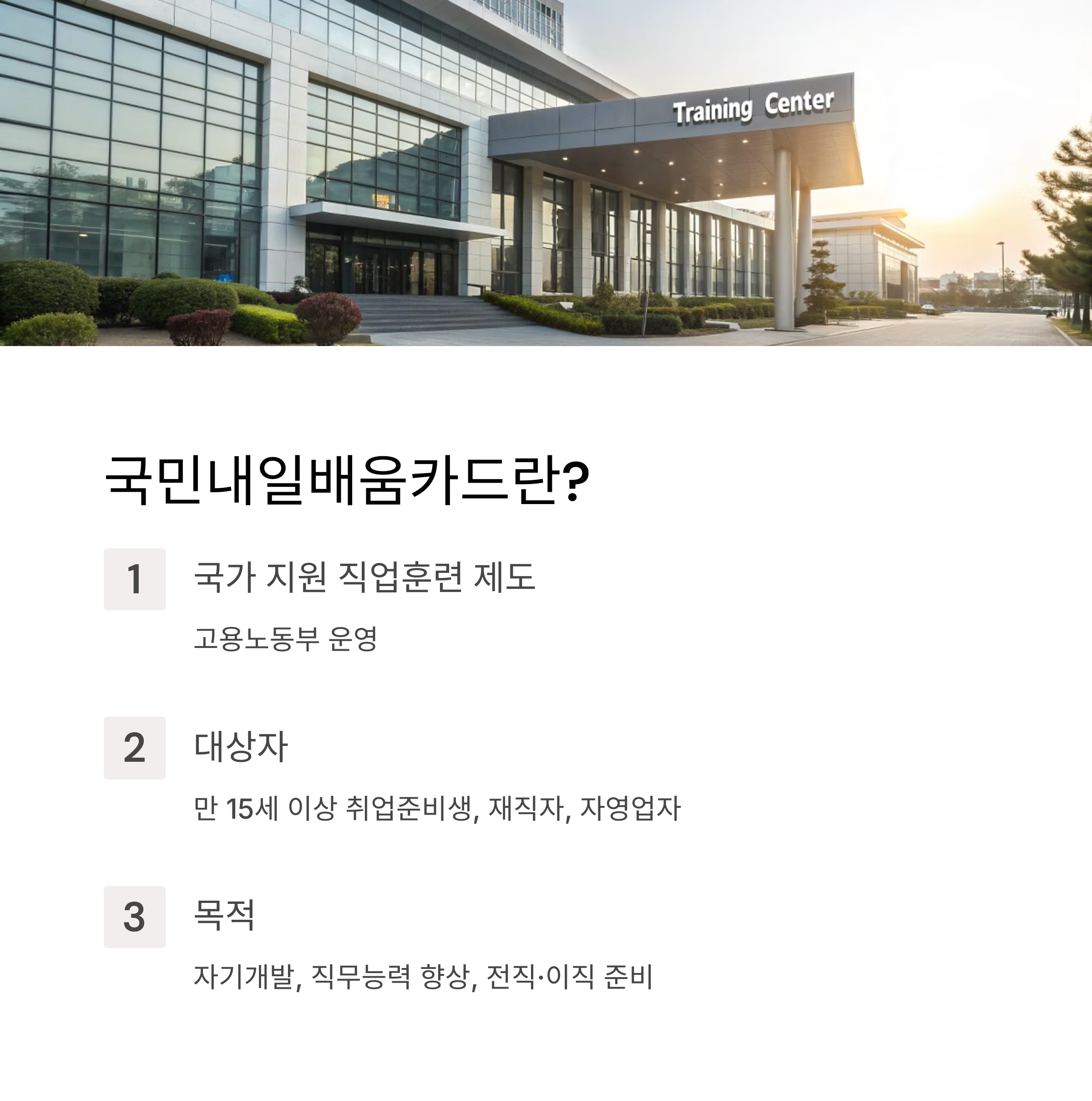 국민내일배움카드는 고용노동부가 운영하는 국가 지원 직업훈련 지원 제도입니다.