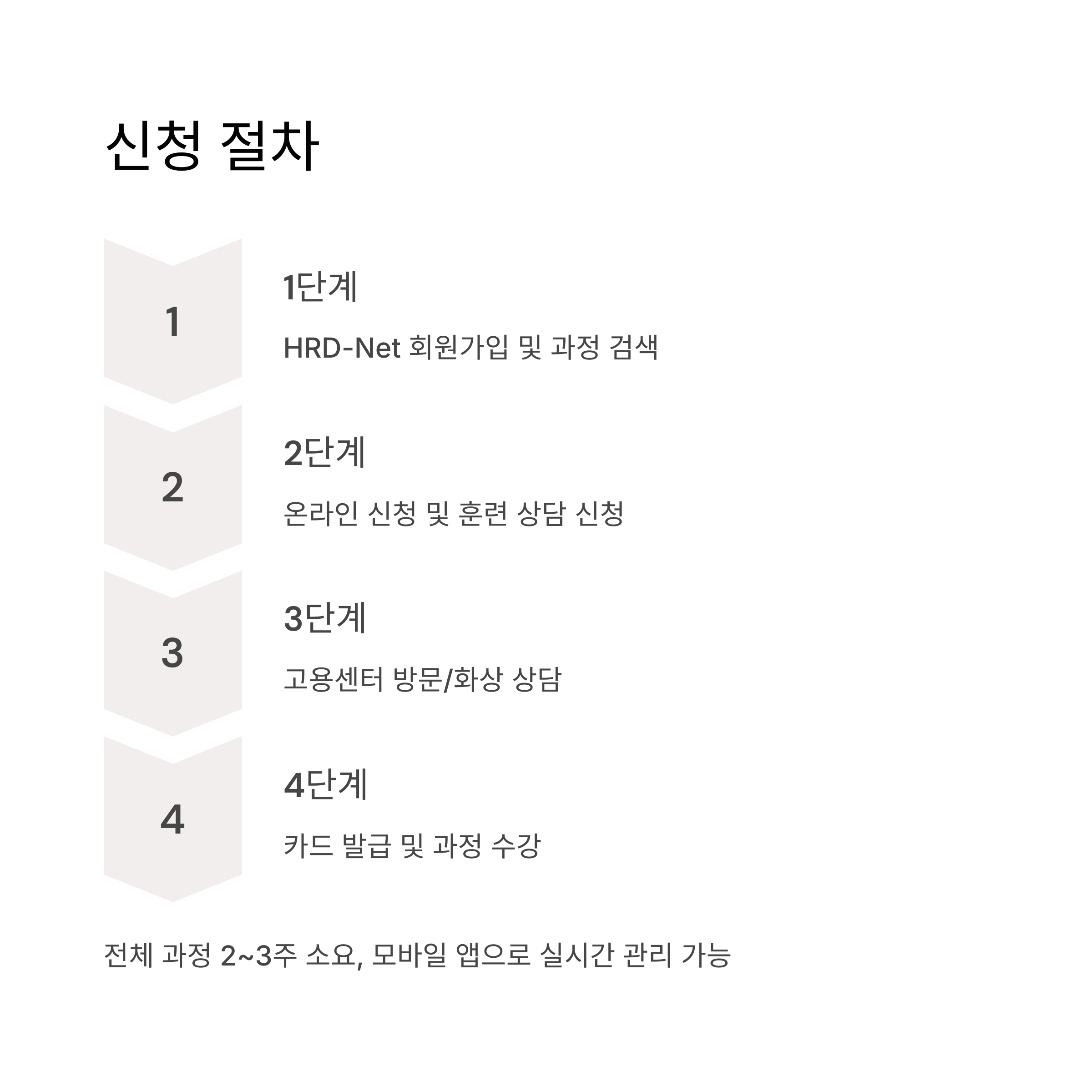 전체 과정은 약 2~3주 이내에 완료되며, 모바일 국민내일배움카드 앱으로도 실시간 관리가 가능합니다.