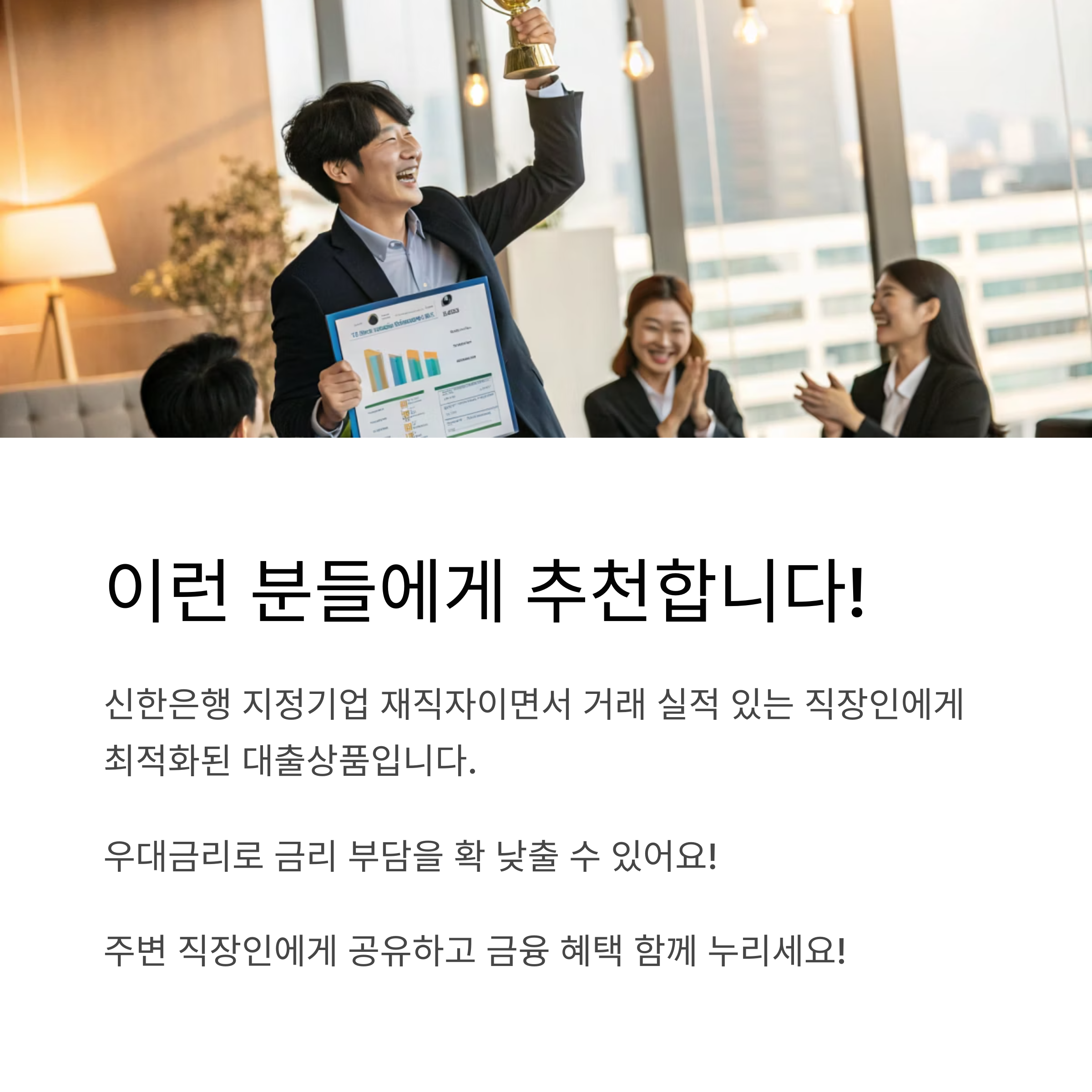 지정기업에 재직 중이며, 신한은행과 일정 거래 실적이 있는 직장인에게 특히 유리한 상품입니다.