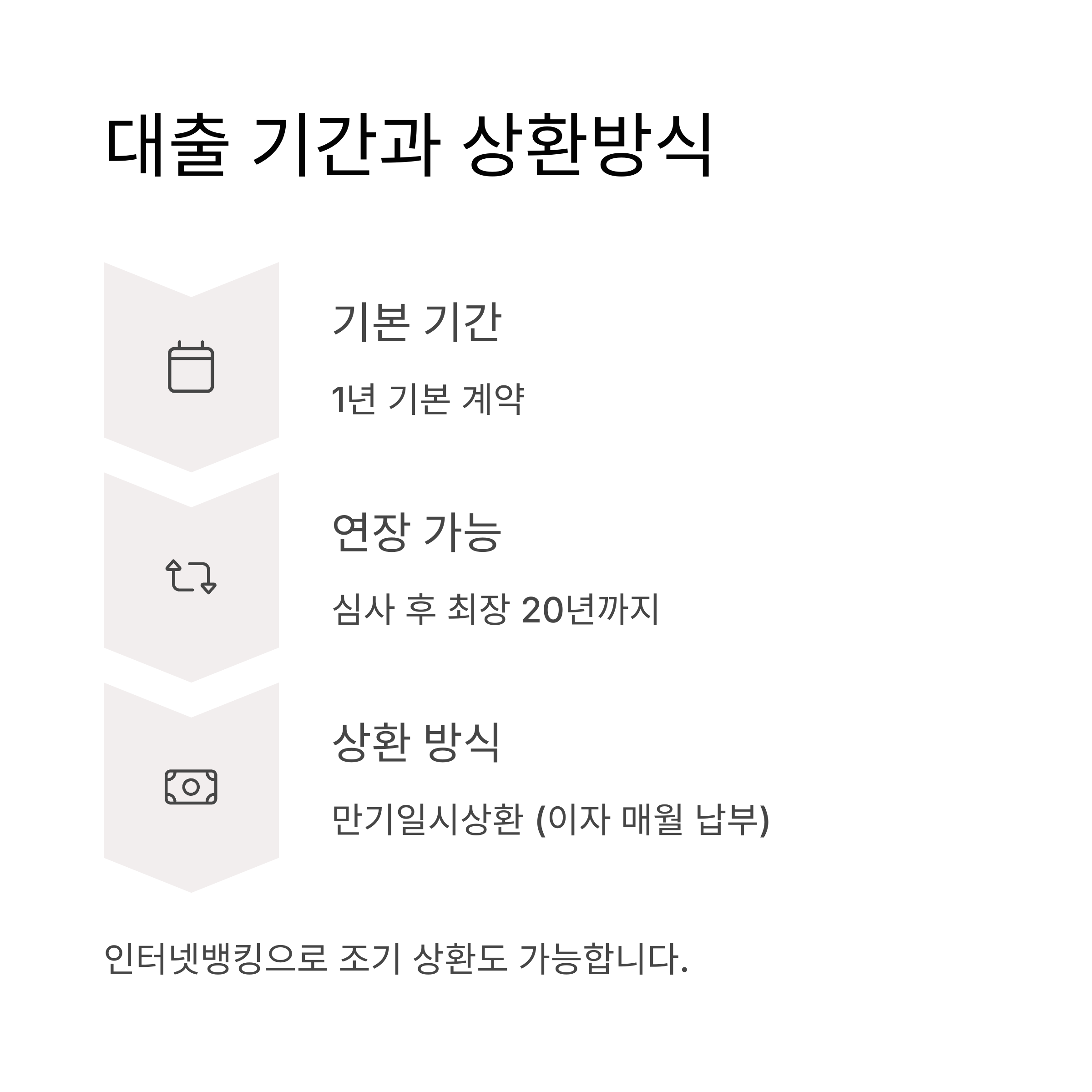 기본 대출 기간은 1년이며, 매년 심사를 통해 최장 20년까지 연장할 수 있습니다.