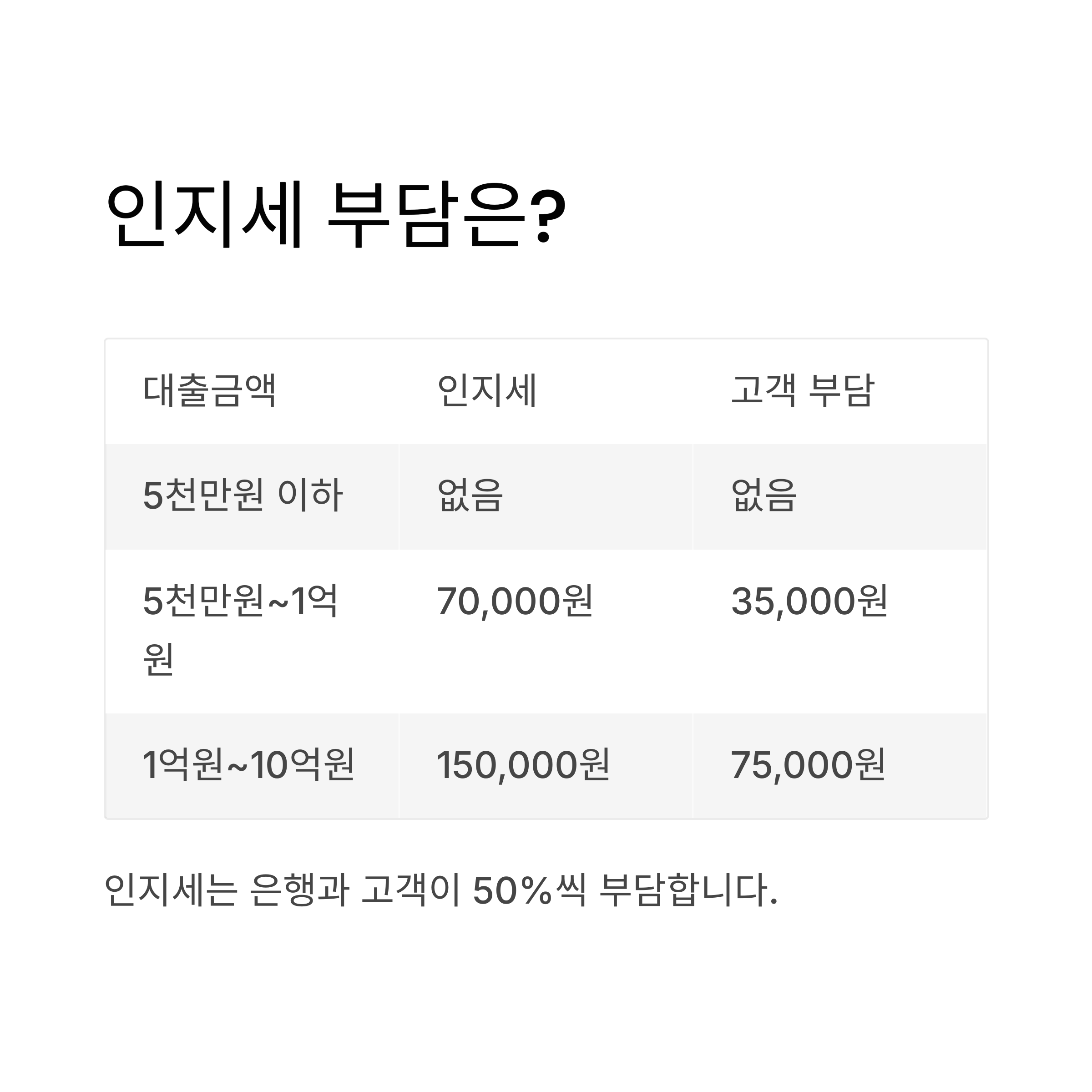 인지세는 대출 금액에 따라 발생하며, 은행과 고객이 50%씩 부담합니다.