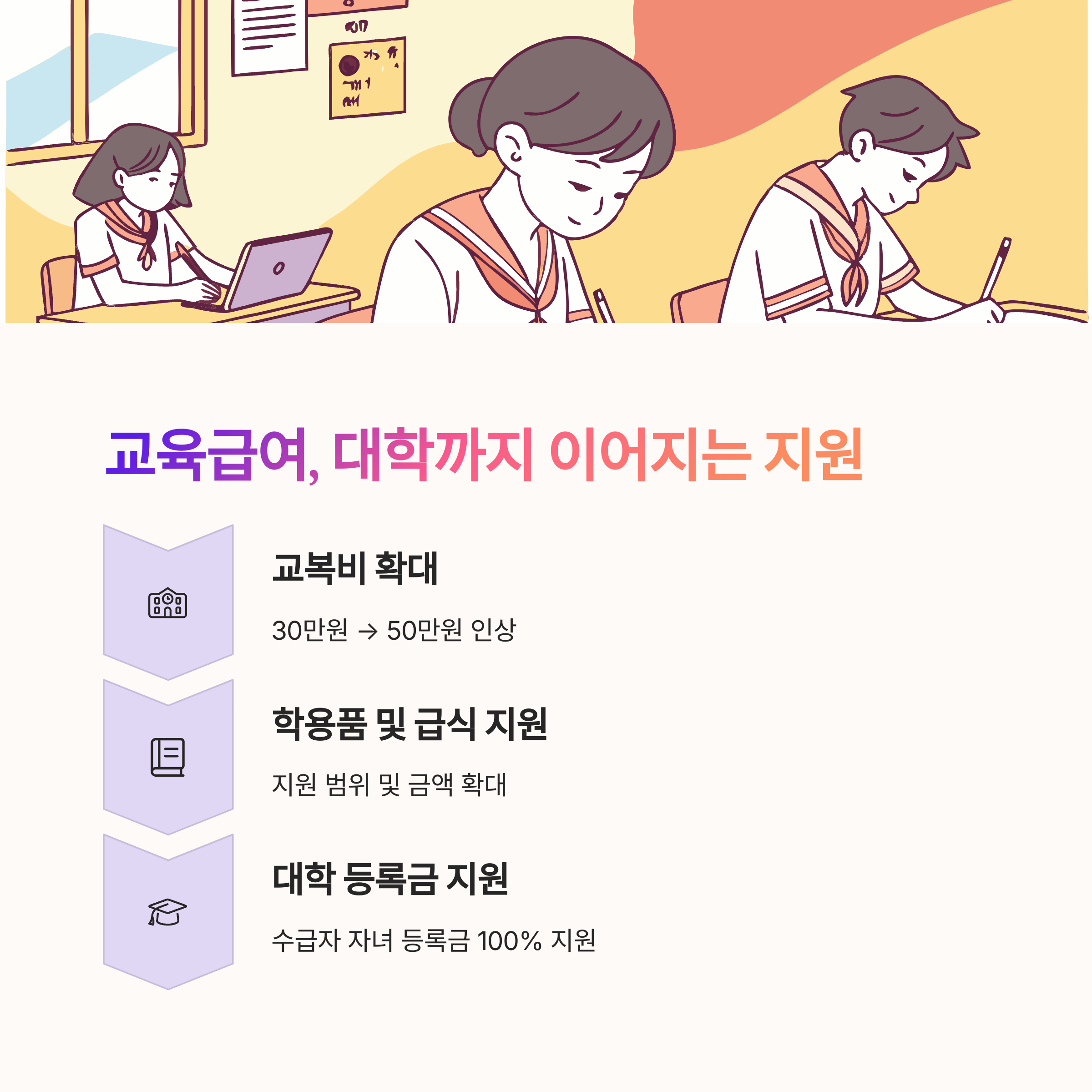 - 고등학생 교복비: 30만 원 → 50만 원 인상