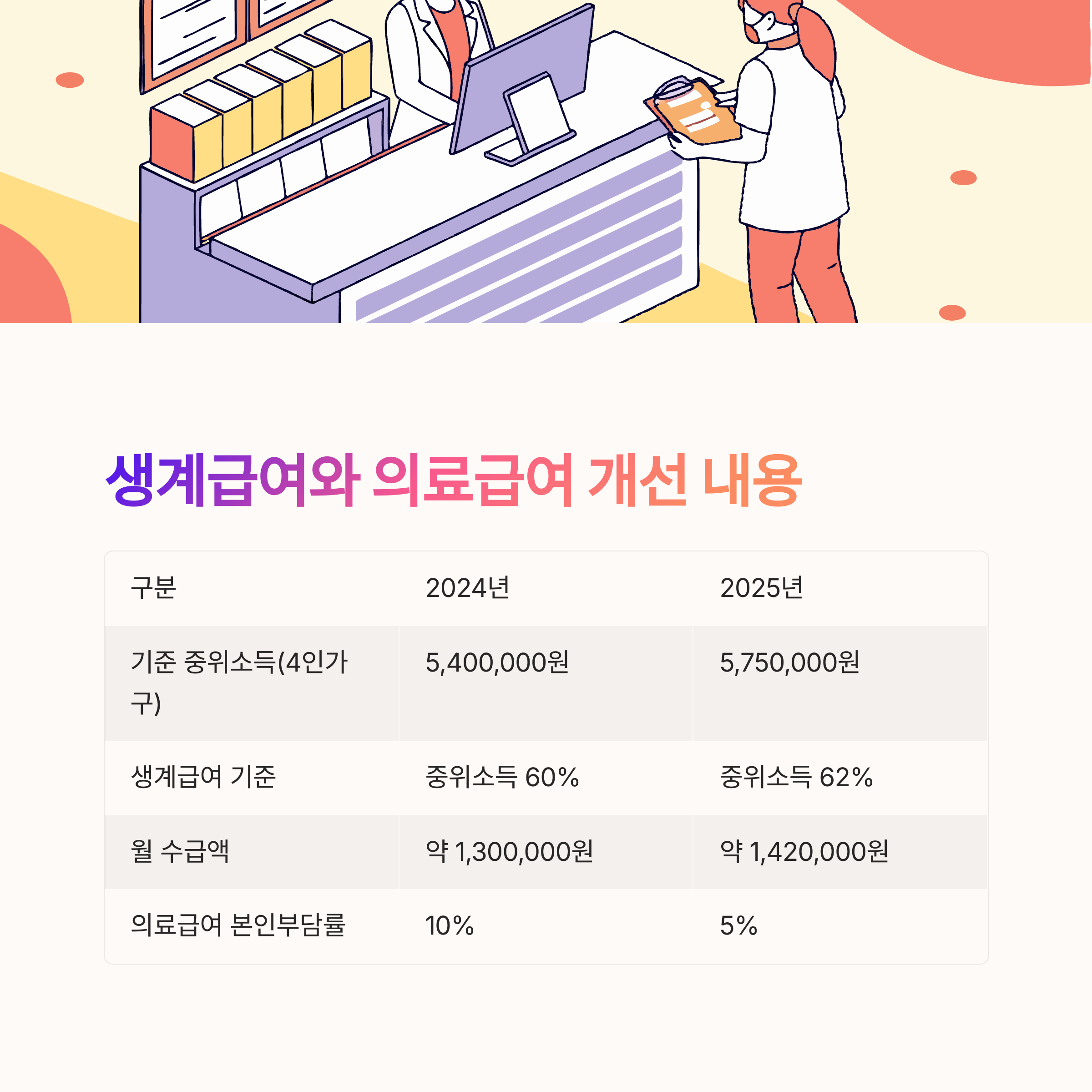 | 중위소득 | 5,400,000원 | 5,750,000원 | 60% → 62%로 상승 |