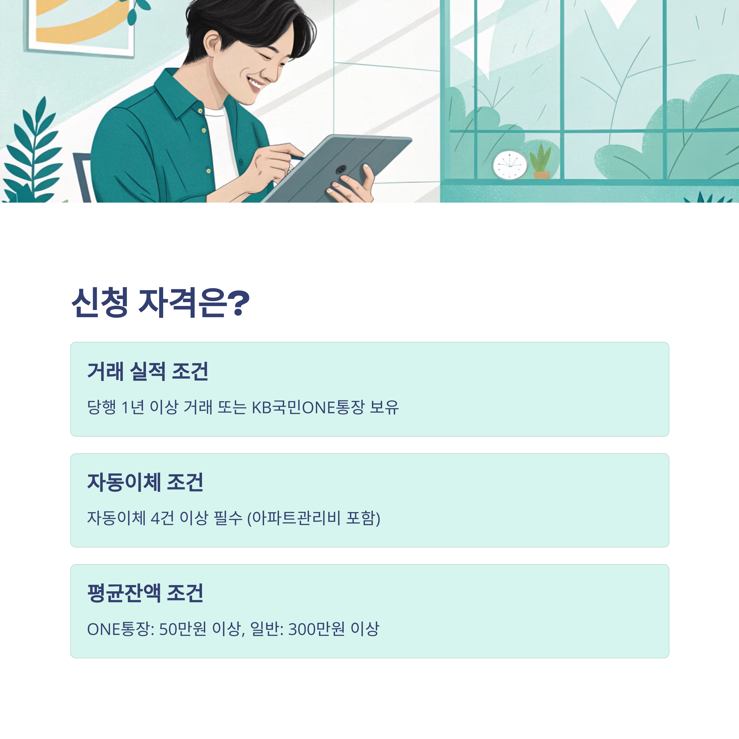 KB국민ONE통장을 보유하고 아래 조건을 충족하는 고객이 대상입니다.
