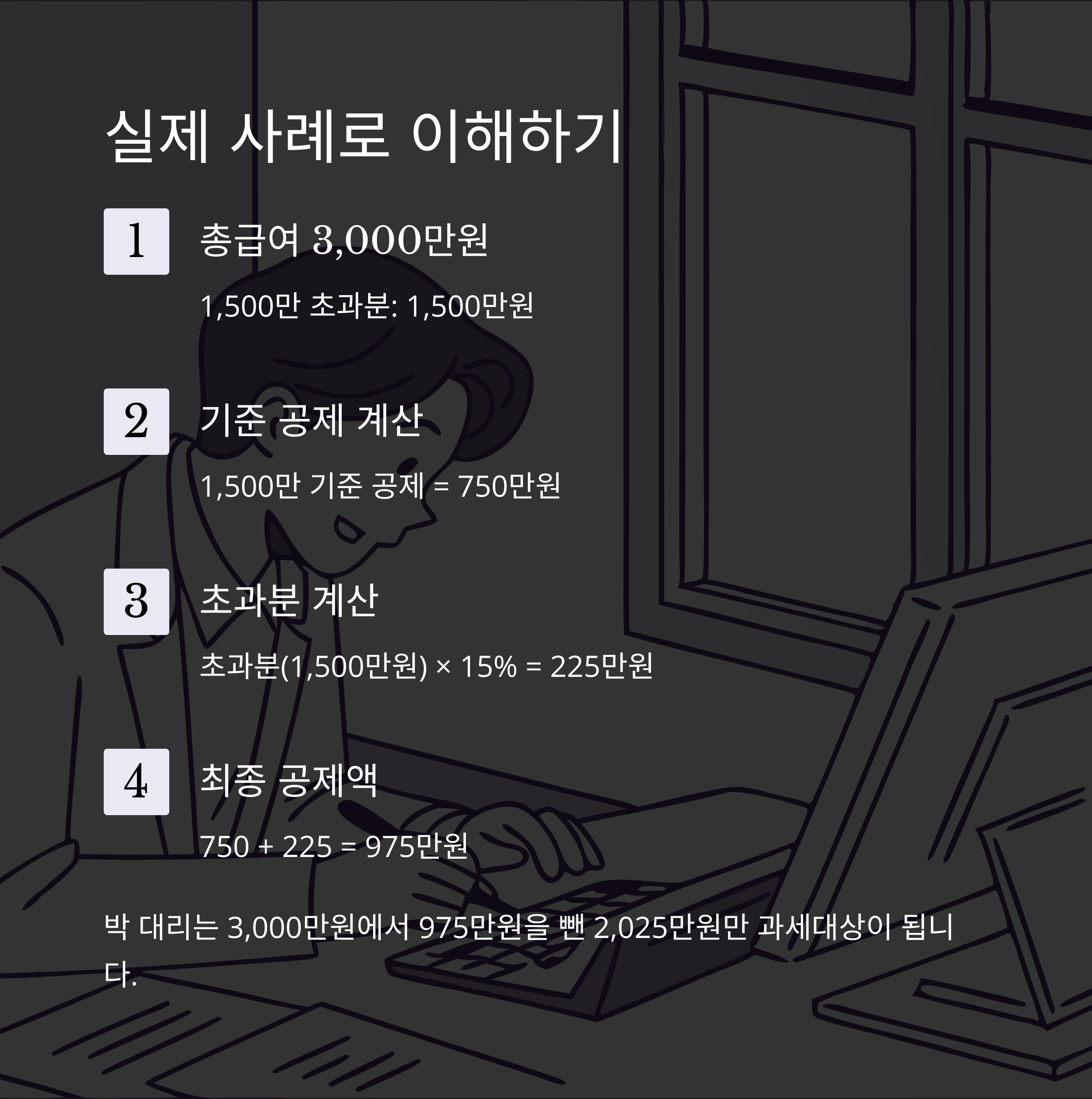 - 총급여 3,000만 원 → 1,500만 초과분: 1,500만 원