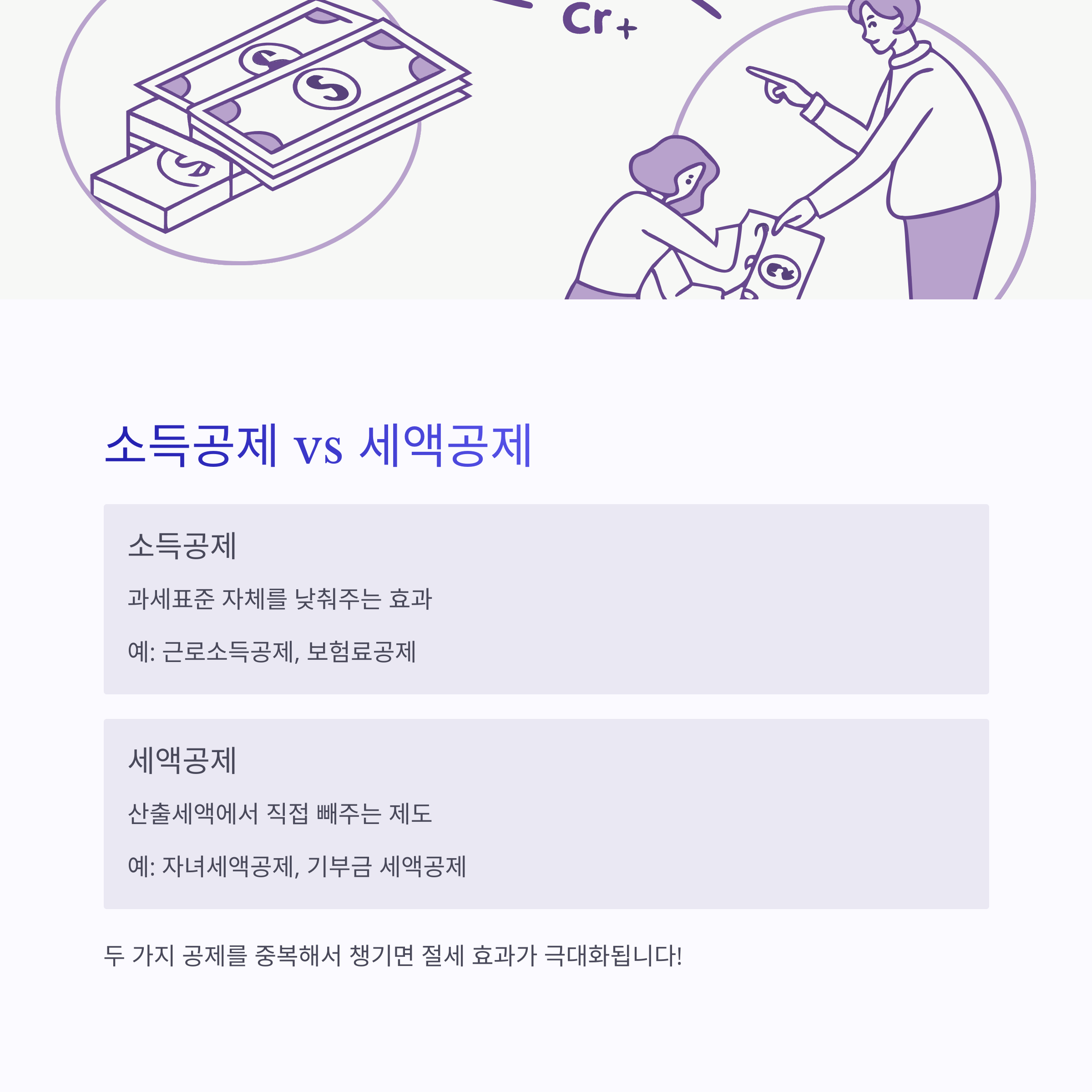 - 소득공제: 과세표준 자체를 낮춰주는 효과 → 대표 예: 근로소득공제, 보험료공제