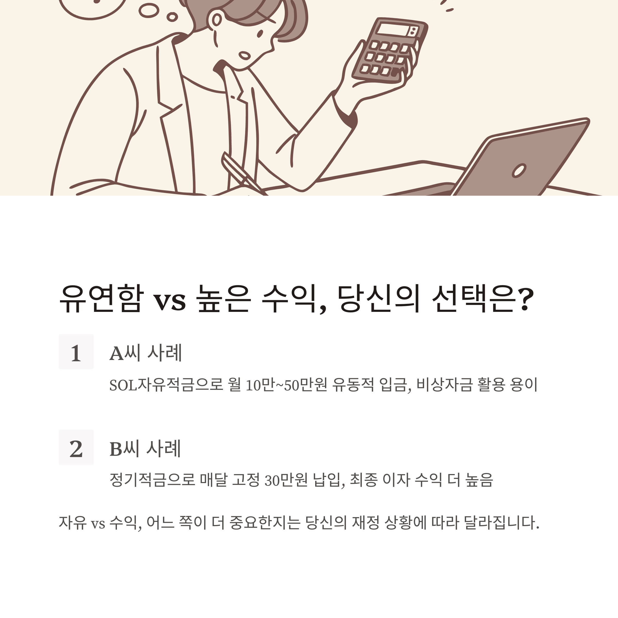 - A씨: SOL자유적금, 월 소득 따라 10만~50만원 유동적으로 입금